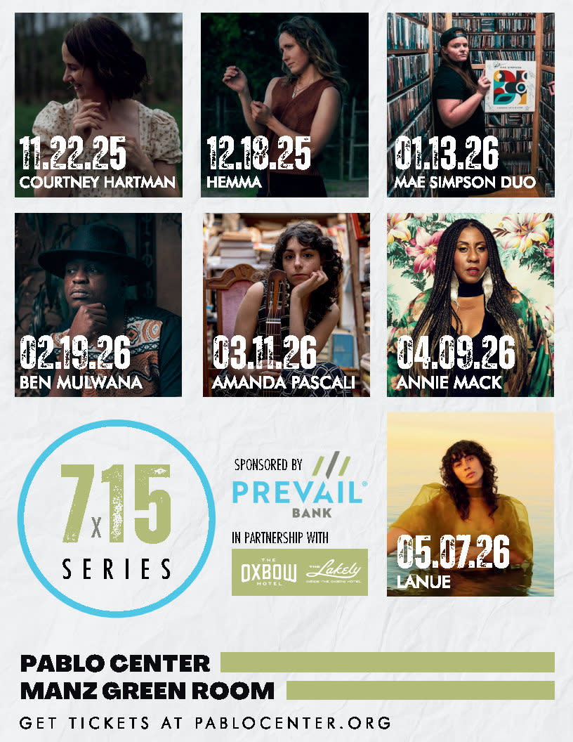 The 715 Series – brought to listeners by the Pablo Center, Prevail Bank, The Oxbow Hotel and The Lakely, among others – welcomes a thoughtful curation of local and regional artists to the side stage from Nov. through May of 2026. .