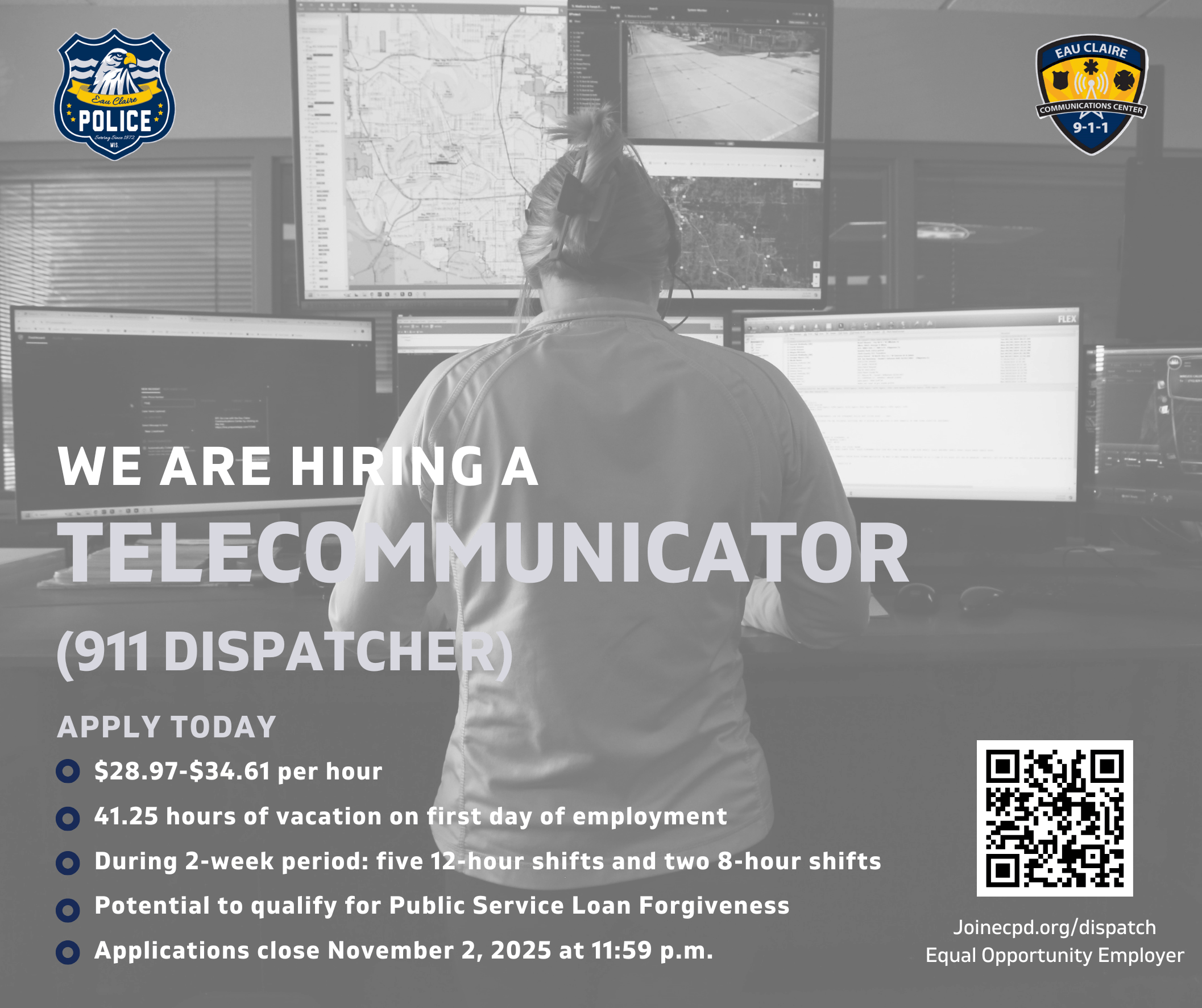 Put your customer service skills to use while serving your community! Help us provide an essential service for Eau Claire County residents and visitors. Join our team as a full-time Telecommunicator (911 Dispatcher)! We are currently hiring in the Eau Claire Communications Center. The Eau Claire Communications Center is one of the longest running countywide, central dispatch facilities in Wisconsin. Civilian Telecommunicators are responsible for all 911 calls and non-emergency calls in Eau Claire County. We dispatch for 14 agencies, including law enforcement, fire departments, and emergency medical services. Applicants will use a computer aided dispatch system, computer records management system, TIME system, and other computer software to effectively complete their duties.